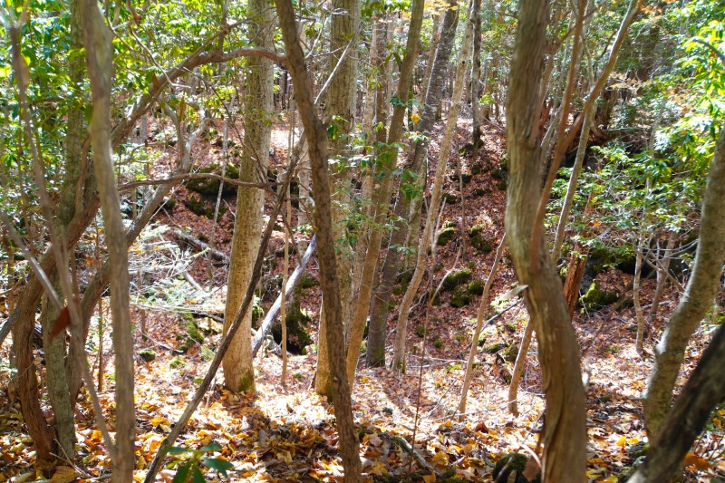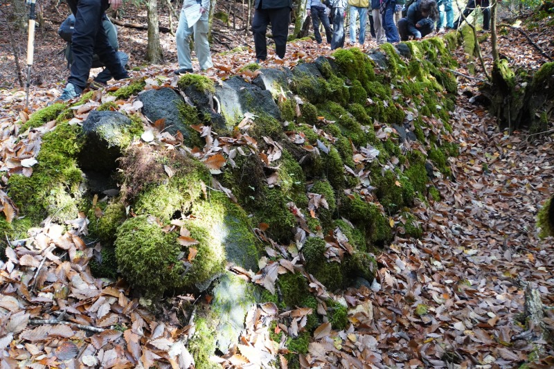下り続けると、岩を積み上げて石垣状に組んだ道が見られる。これによって窪んだ地形を歩きやすくしているなど、林業のために車両が通れるようにした痕跡が見られるのも面白い。樹海の中の自然資源によって産業も発達し、人々の生活に潤いをもたらしていたのだ。