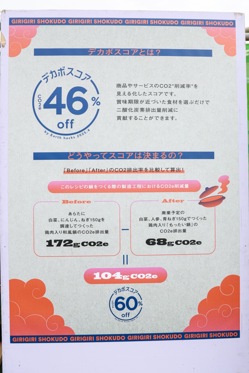 また、待機列には、「脱炭素啓発コーナー」としてフードロス問題やデカボスコアに関する展示ボードが設置されていて、鍋提供までの待ち時間にも脱炭素の知識を得られる機会が設けられていた。