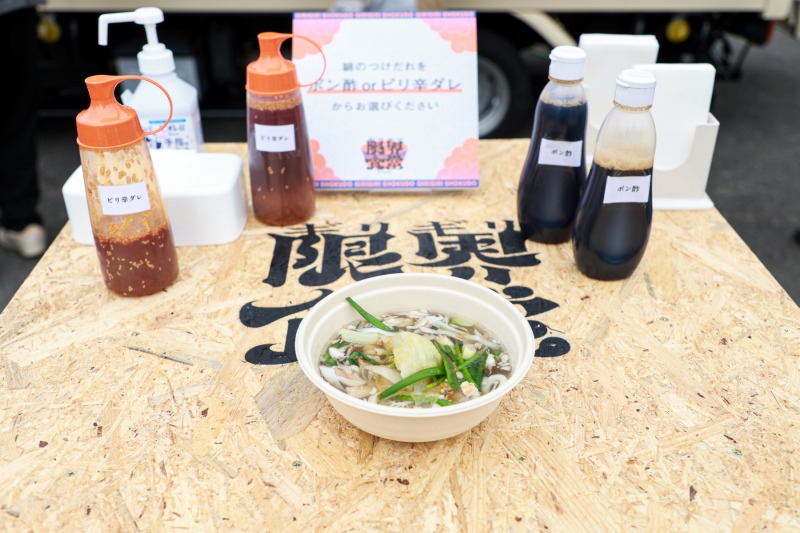 次に、「もったい鍋」が出来上がるとキッチンカーで受け取り、お好みでポン酢とピリ辛ダレを選んで使うこともできる。「もったい鍋」は、鶏だしの汁と鶏肉は最初から入っていて、最初から味もついている。