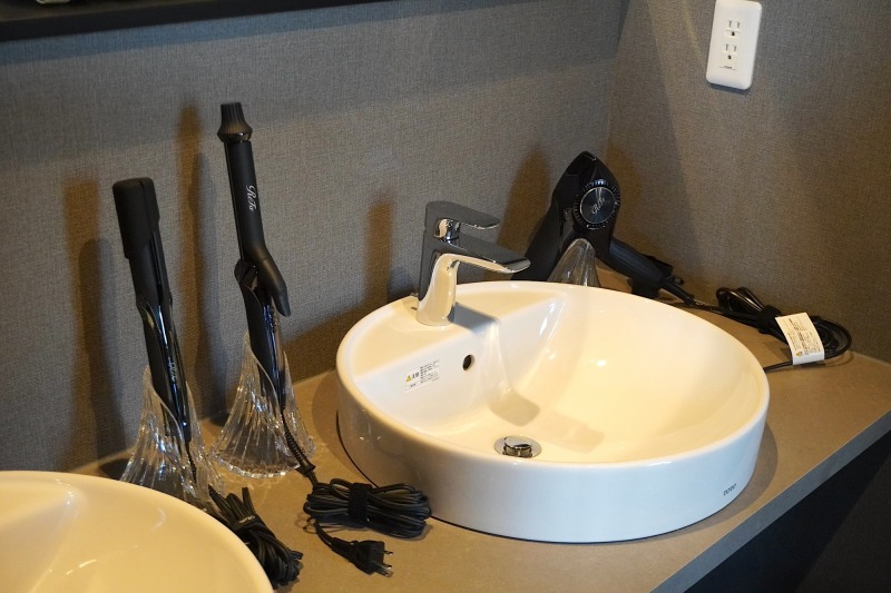 洗面台にはReFaのドライヤーに加えて、ReFaのヘアアイロンやスキンケアセットなどもあり、女性は嬉しい。浴室のReFaのシャワーヘッドは全室完備。