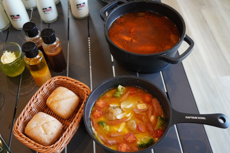BBQは富士山の麓で丹精に育てられたブランド牛「富士山黒牛」のステーキをメインに、旬の野菜やアヒージョ、魚介たっぷりのブイヤベース、魚介のグリル、そしてデザートなどボリュームもたっぷりで大満足。朝食は地元食材を使用した和洋食が選べるようになっている。