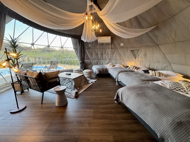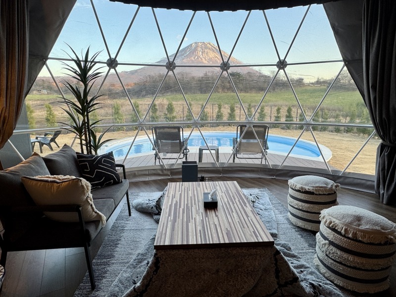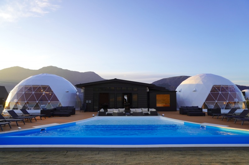 グランピング施設に多いドームテントは直径7mと8mで5種類用意。うち3棟はプール付きでラグジュアリーなグランピング滞在が叶う。