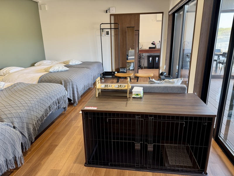 ペット用の足洗い場、ゲージ、水飲み用品、トイレなども完備。セミダブルベッド4台で定員4名のため、ペット連れのファミリーやカップル、ご友人同士での滞在にピッタリだ。