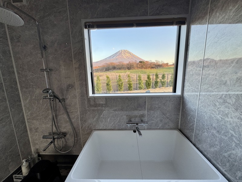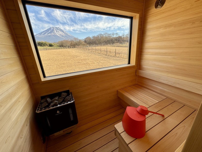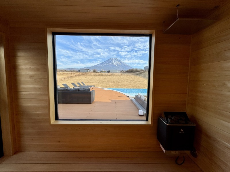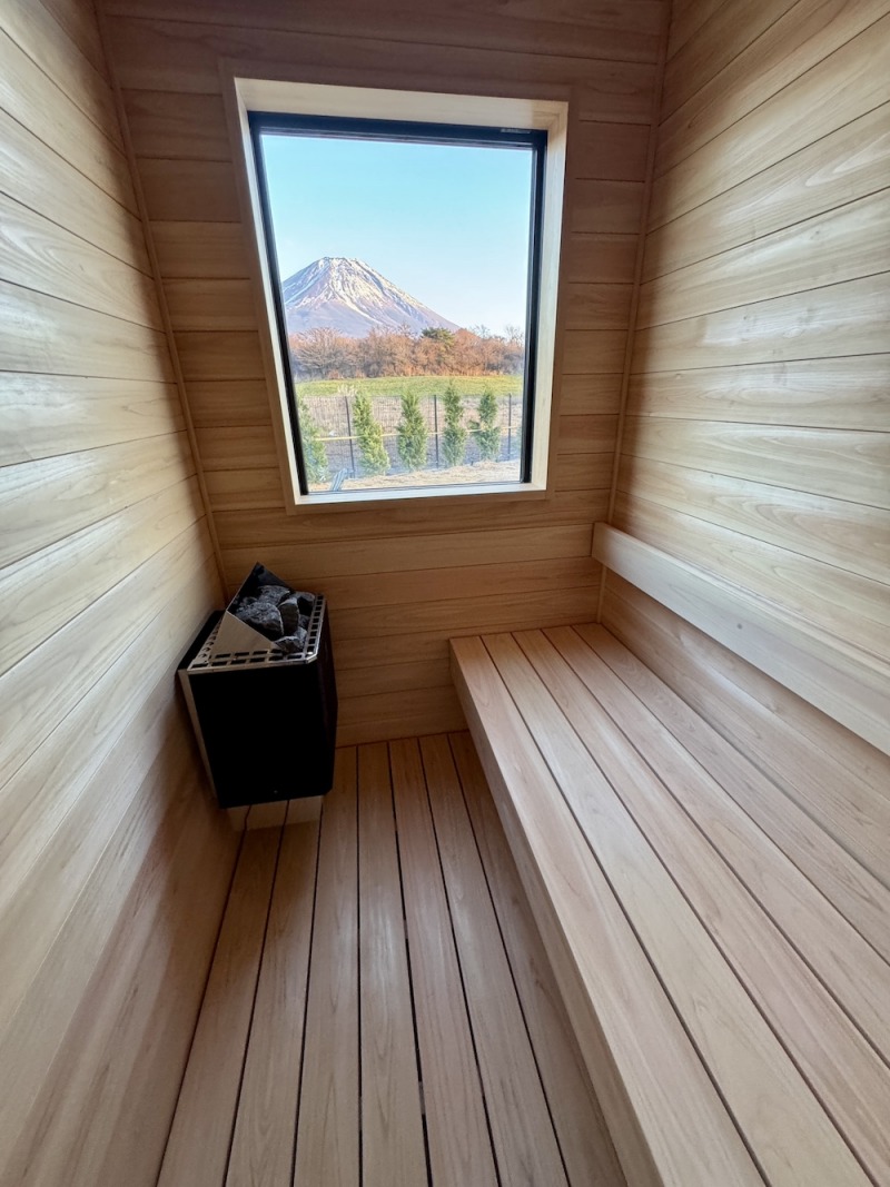 バスルームのお風呂は広々としていて、そこを抜けるとプライベートサウナ。ロウリュウ式のサウナでじわっと体が温まる。そしてサウナルームからも富士山が眺められる贅沢な造りなのもラグジュアリーを感じるポイントの一つだ。