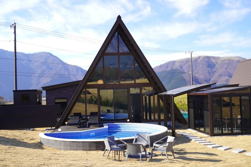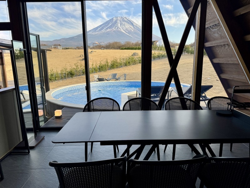三角屋根の建物の中にはキッチンやダイニングが備わっていて、目の前は富士山ビューとなっている。