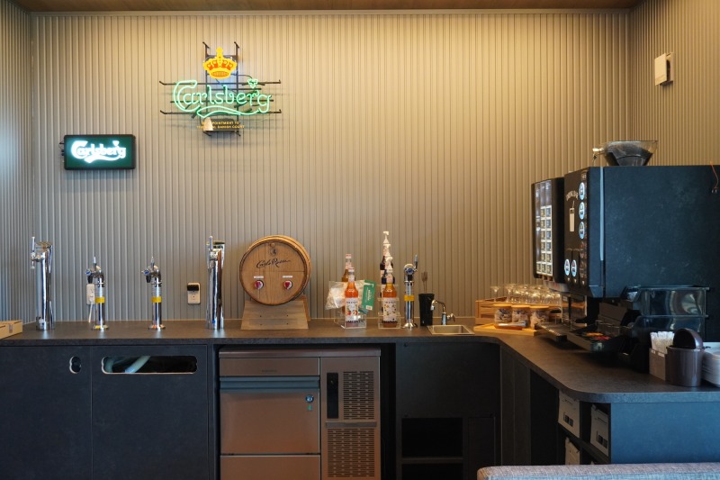 管理棟にはインクルーシブサービスとしてドリンク飲み放題のBARスペースがある。ビール、レモンサワー、ハイボール、カクテル、ソフトドリンクなど、お好みのものが飲み放題と大人も子供も嬉しいサービスだ。