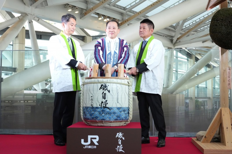 鏡開きセレモニー&お披露目イベントには、「磯自慢酒造」代表・8代目蔵元の寺岡洋司氏、「SAKECOMPETITION」実行委員長の長谷川浩一氏、JR東日本 マーケティング本部 まちづくり部門 品川ユニット ユニットリーダーの河合秀智氏が登壇。
