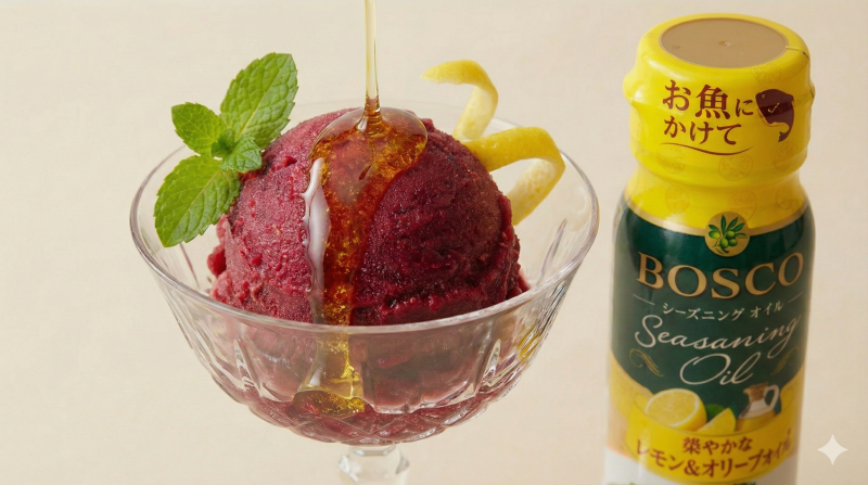 パーティーにぴったりのデザート、赤ワインのソルベを用意して、「BOSCOシーズニングオイルのレモン&オリーブオイル」をひとたらし。レモンの風味が加わって、美味しさが増しますよ。
