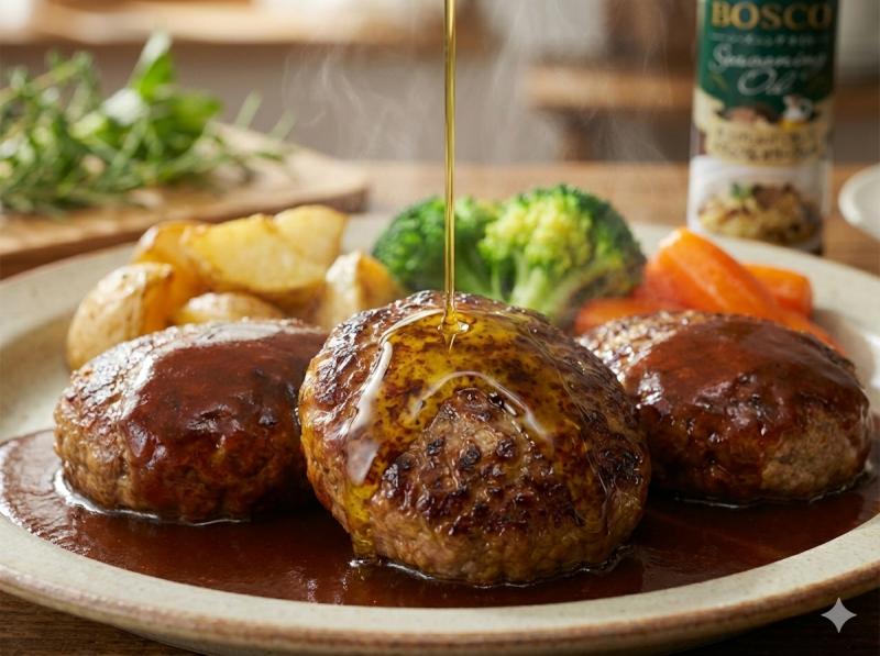 BOSCOエキストラバージンオリーブオイルにトリュフの風味がプラスされているので、贅沢で芳醇なトリュフ風味のハンバーグに!
