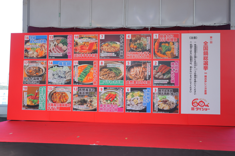 1月17日から横浜赤レンガ倉庫イベント広場で開催されている「酒処 鍋小屋 2026 supported by ダイショー」内の企画として、来場者投票で“お家でも食べたいご当地鍋”を決める「第1回 全国鍋総選挙 in 横浜赤レンガ倉庫」が初開催された。1月29日には表彰式が行われ、グランプリを含む上位入賞鍋が発表。プレゼンターは、横浜DeNAベイスターズ元監督の中畑清が務めた。