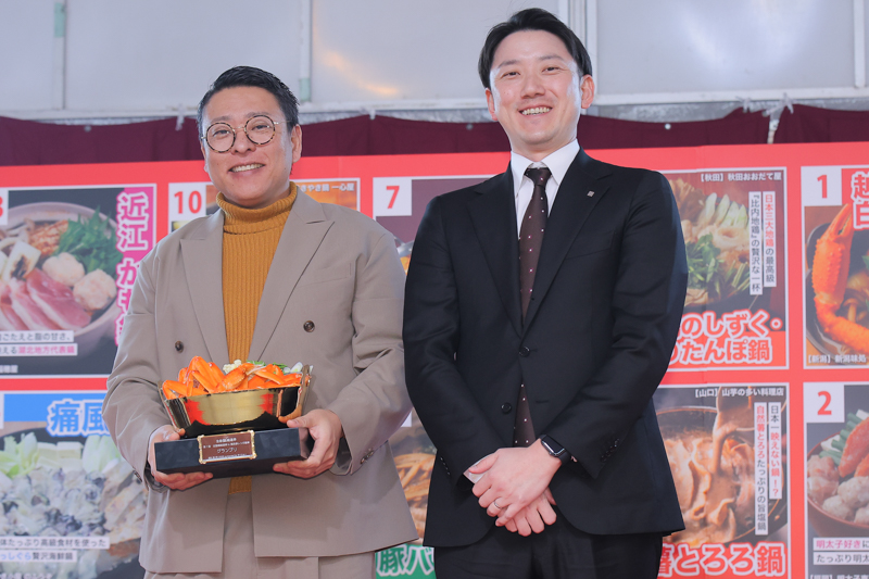 順位発表では、3位が「比内地鶏のしずく 秋田きりたんぽ鍋」、2位が「近江牛すき焼き鍋」と発表された。中畑氏は試食しながら、3位には「おいしいよ」、2位には「肉の甘みがいいね。おいしいの当たり前です!」と、歯切れのいいコメントで会場を盛り上げた。